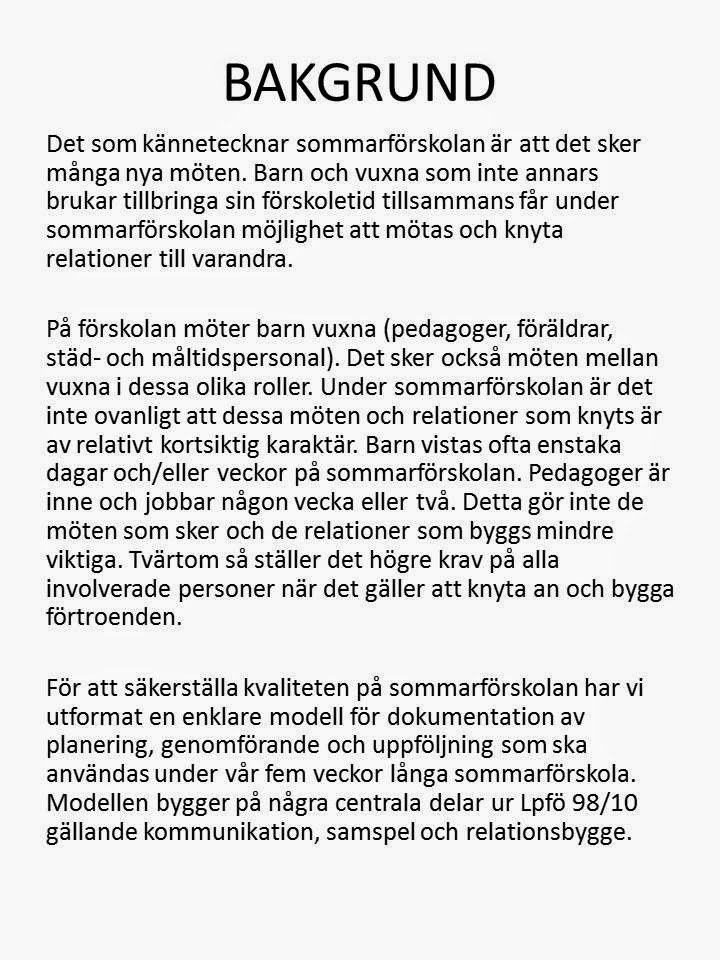 I vårt förskoleområde så satsar vi fr o m i år på att koppla sommarförskolans verksamhet till det systematiska kvalitetsarbetet. Jag har frågar runt lite, via Twitter och olika Facebook-grupper, och det verkar som att vi har lyckats pricka in ett svart hål inom svensk förskola. Någon enstaka har hört av sig med exempel på kvalitetsdokument kopplat till sommarförskola. Enormt många har hört av sig och vill ta del av våra dokument. Många har också delat med sig av dåliga erfarenheter relaterat till sommarförskola. Därför känns det extra angeläget för mig att dela med mig av vår satsning. För barnens skull. Alla barn som vistas i förskolan har rätt till bra verksamhet, oavsett årstid.